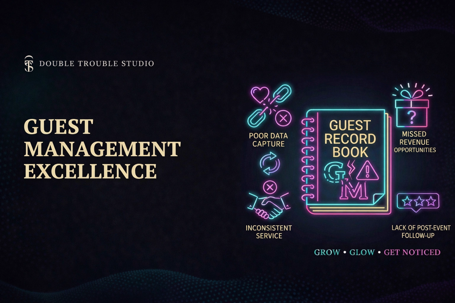 At Double Trouble Studio, we design guest management systems that combine RSVP architecture, VIP segmentation, entry flow mapping, and post-event loyalty frameworks — all aligned with your brand positioning.